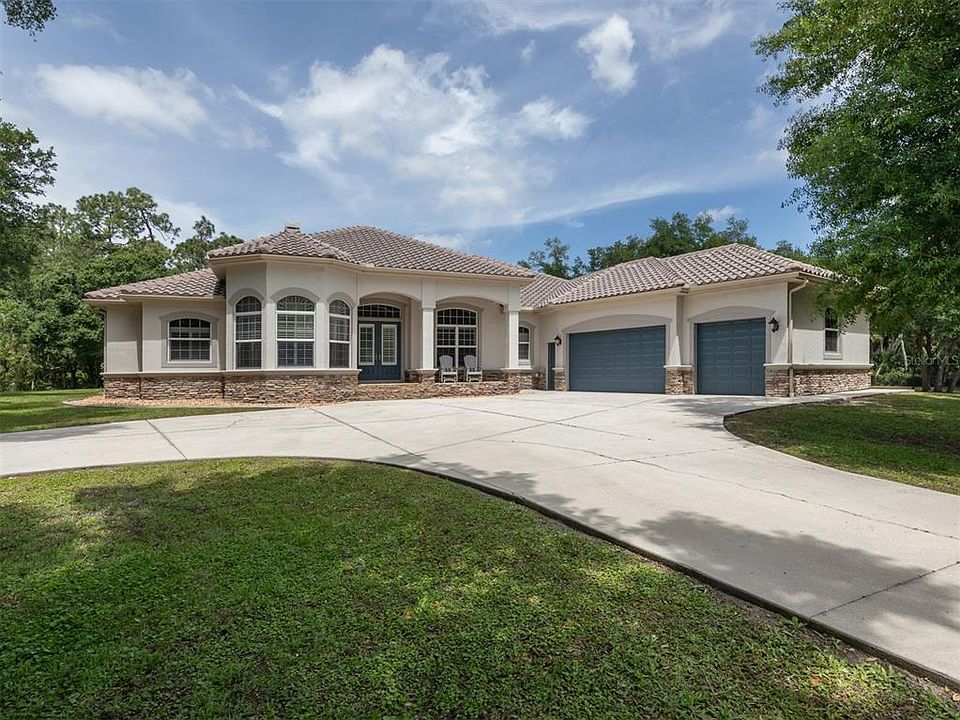 Beautiful home on 3 acres waiting for you! Don’t miss your opportunity to own this exquisite 4 bedroom, 4 1/2 bath estate, complete with an executive office and a spacious outbuilding. Set on 3 private, fenced acres with a gated entrance, this home offers luxury and security. Constructed in 2006 as a safe haven against Florida’s intense storms, the builder elevated the home to a Flood Zone X. This home includes oversized stem wall footings, fiber mesh reinforced concrete slab, bidirectional steel, and reinforced masonry walls with concrete tie beams. It is also equipped with hurricane-impact insulated glass and the roof is tied down with heavy truss anchors. The estate showcases a new tile roof, gutters, downspouts, water heater and freshly painted exterior. The upgraded Culligan water filtration system and reverse osmosis under the kitchen sink enhance this already impressive home. Its elegant interior is designed with high tray ceilings, crown molding, and beautiful tile flooring throughout. The layout includes living and family rooms, a formal dining room, a wood burning fireplace, and an oversized game room with wet bar. Custom built-ins enhance the office, and the chef’s kitchen features a walk-in pantry, stainless appliances, granite countertops, cherry wood cabinets, and an island. The primary suite is a true retreat with tray ceilings, a luxurious bathroom, blackout shades, and two large walk-in closets. The seamless flow between the family, living, and dining rooms makes it ideal for entertaining. Outdoors, the property boasts two showers and a stunning pool area with a waterfall, grotto, heated spa, and an integrated outdoor kitchen, perfect for relaxing or hosting gatherings. The oversized 32 x 36’ outbuilding features three large 16-foot reinforced garage doors, perfect for RV or boat parking, with a 30-amp plug and a 220 outlet. The space could also be used as a workshop. The home also includes a whole-house Generac generator backed by a 1,000-gallon propane tank and an additional 250-gallon propane tank for the grill and gas stove. This beautiful home is waiting for you!