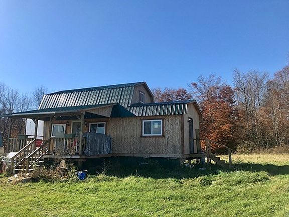 HUNTERS PARADISE! This rustic cabin can easily be finished and used as a year round home. Panoramic country side views, with a long driveway leads you to your secluded location. 1st level offers a eat in kitchen w/ appliances staying, living room, and a full bathroom. 2nd level is currently a big open space to make into your own. Excellent hunting, covered front deck, 40X30 outbuilding/garage. Owner has metal skirting that will stay with new owner. Electric has been inspected & passed. With some finishing work, this property can be beautiful!