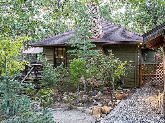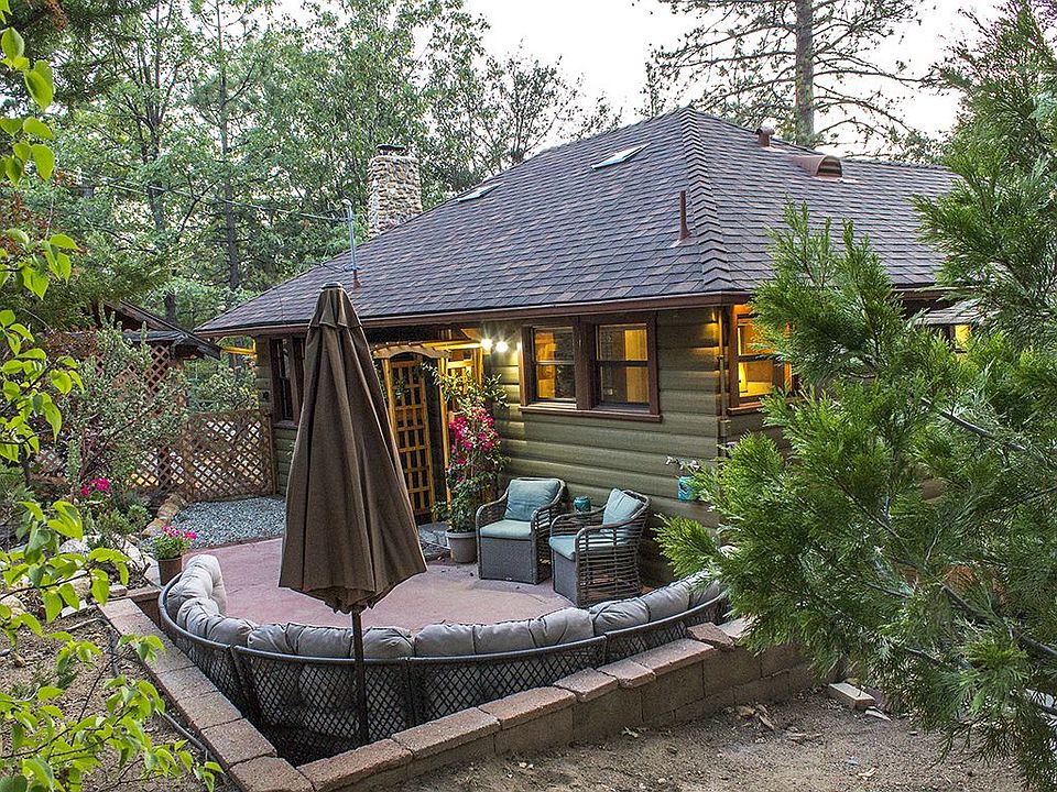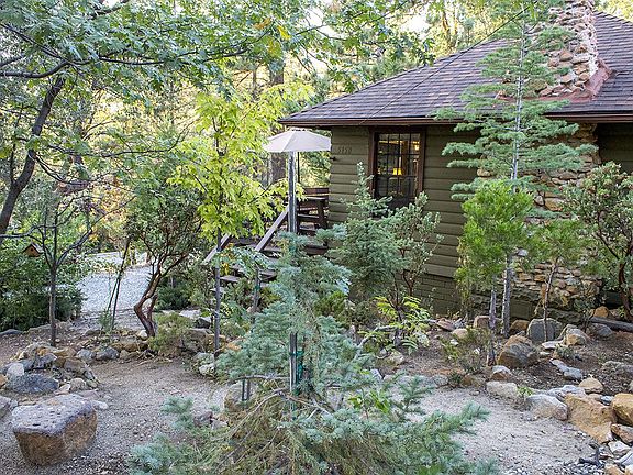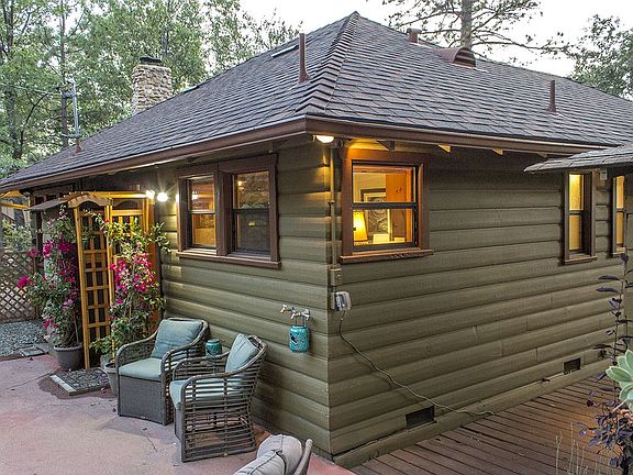 This Enchanting cabin, is tastefully remodeled in 2016. A 1 bedroom and bath cabin. PLUS a lovely detached office/studio. Original open beam ceiling throughout, cedar walls, brick wood burning fireplace and unique manzanita mantle. Privately situated. Easy level access from carport to one story house. Spacious light filled living room with walls of windows. Dreamy bedroom - light and bright w/ 3 large windows. New bathroom - oversized walk-in shower w/pebble stone floor, toilet, vanity and sink. Cheerful kitchen new peninsula counter/bistro bar,a great room like setting, with vintage knotty pine cabinets. Inspiring Detached Office/Studio. Perfect for home business, writing, arts and crafts or yoga (even guest sleeping). Additional NEW Major Improvements: Laminated wood plank floor, furnace and heating system, new roof, ceiling insulation, "Quiet Cool" whole house fan, custom window coverings, updated & improved plumbing and electrical, exterior paint on house, office/studio, storage shed and deck. The backyard has a courtyard feel with a lot of privacy and a fully fenced in yard. The front porch allows you to see the evening glow with the setting of the sun. A magical cabin.