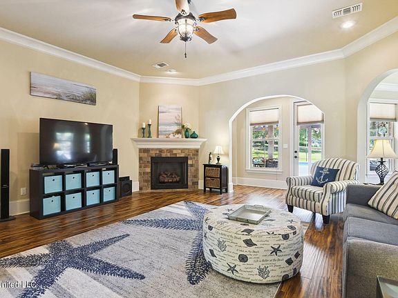 This magnificent 1,800 square foot brick residence is situated on the 14th Fairway of the Pine Golf Course in Diamondhead. Featuring a swimming pool and meticulously maintained landscaping, this unique home boasts a range of amenities. Enjoy the spacious living room with a cozy fireplace and high ceilings. Experience the abundance of natural light and scenic pool and golf course views through arched cased openings. The kitchen is equipped with a sizable island and ample cabinet storage space. The expansive primary bedroom with custom tray ceilings includes a lavish bathroom with a jetted tub, separate shower, and dual vanities.