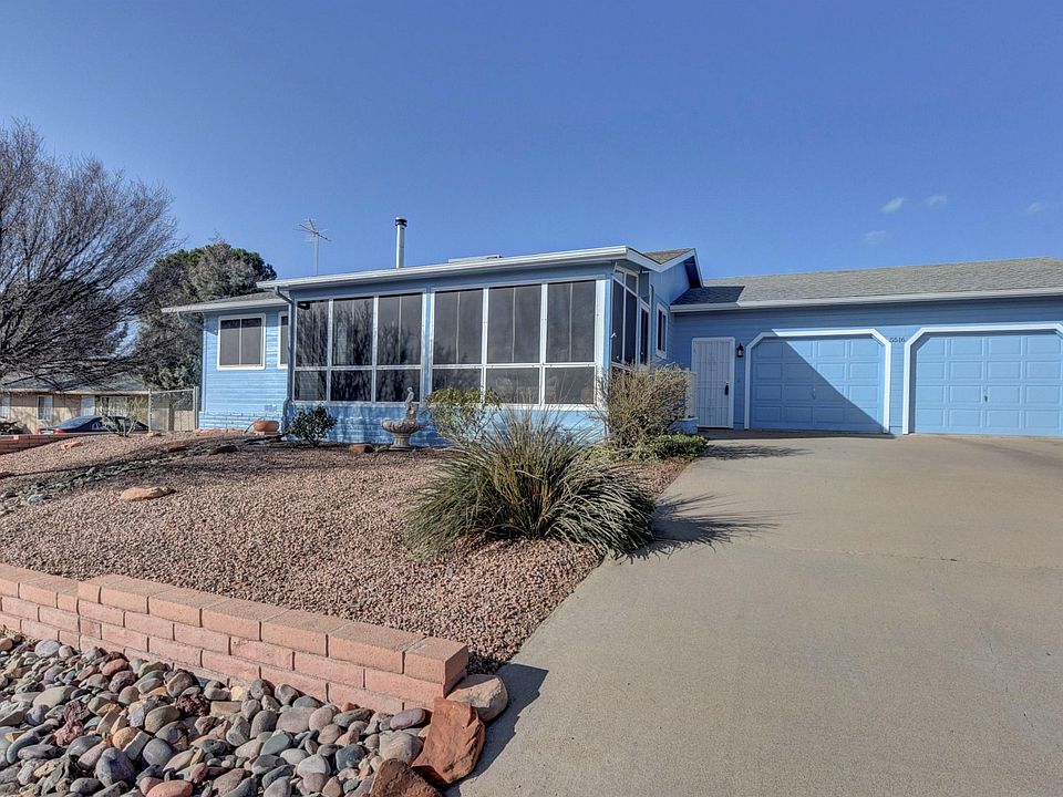 METICULOUS and charming site-built home in Prescott Valley sits at the crest of a hill for beautiful views of the entire Mingus Mountain range! This home has been a second home for many years and is in outstanding condition. Walk in first to an sunny enclosed AZ room w/newer vinyl wood-look floors & loads of windows. From there enter the super cozy Living Rm, dining area & UPDATED kitchen, featuring newer cabinets, appliances, solid surface counter tops. Huge laundry room, nice guest bath, office, 2nd bedroom and VERY large master bedroom suite. Additional back enclosed porch adds additional space and is not included in sq. footage. Super neat fenced back yard with fruit trees and garden beds. Lots of parking in the driveway and a HUGE 2+ GARAGE W/WORKSHOP or storage space. So sweeet!