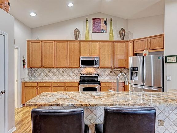 - Interior Features: Ceiling Fans(s), High Ceiling(s), Living Room/Dining Room Combo, Master Bedroom Downstairs, Split Bedroom, Walk-In Closet(s), Open Floorplan, Solid Wood Cabinets, Eating Space In Kitchen, Kitchen/Family Room Combo, Stone Counters, Thermostat
