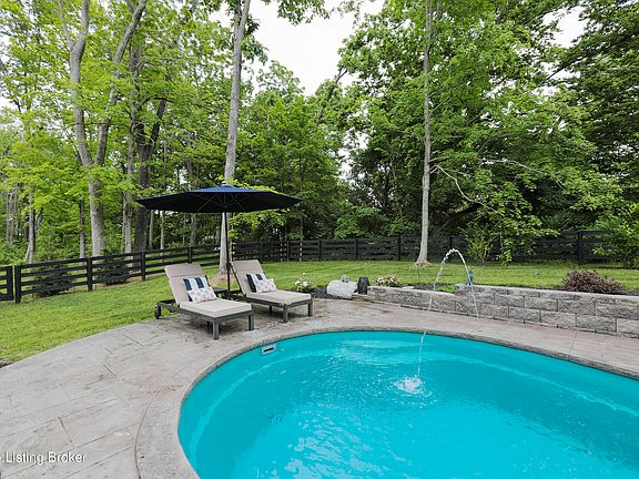 Southern Living at its finest - a private wooded retreat with resort-style amenities! Welcome to this stunning residence nestled on a serene, private, wooded lot in the heart of Oldham County. Just two years young, this exquisite residence perfectly blends timeless charm, elegant design, and luxurious comfort. Framed by lush, mature landscaping, the home's expansive and inviting front porch sets the tone for the warmth and hospitality found throughout. Step into a backyard oasis designed for pure enjoyment and relaxation. A private saltwater in-ground pool beckons on warm days, while a cozy fire pit area invites evening gatherings -- all surrounded by the calming backdrop of nature. Additional outdoor living includes a grilling patio off the walkout lower level and a spectacular vaulted screened-in deck featuring a gorgeous stone fireplace - the ideal spot for enjoying quiet mornings over coffee or entertaining year-round. Through wood French-style doors, the two-story foyer welcomes you with soaring ceilings and opens into a dramatic great room with exposed staircase and overlook landing that spans this level. The light-filled main level living space boasts a stone fireplace flanked by built-ins, a wood beam, and a grand chandelier - all seamlessly connected to the heart of the home: a chef's kitchen with an oversized quartz island, sleek custom cabinetry, and a walk-in pantry with a showstopping stained French door entry. The main level also features a sophisticated study or sitting room with French doors and custom wainscoting, mirrored in the adjacent formal dining room, which also offers a tray ceiling and elegant millwork. The primary suite is a true sanctuary with richly stained wood-beamed ceiling detail, serene views of the backyard retreat, and a spa-like en suite bath complete with dual vanities, a soaking tub, a designer-tiled walk-in shower, separate water closet, and a fully built-out walk-in closet. A guest powder room and well-equipped laundry room complete this level. Upstairs, a cozy loft overlooks the great room and leads to a spacious second-floor den. This level includes a guest suite with en suite bath access, plus two additional bedrooms with walk-in closets that share a well-appointed full bath - all with high-end quartz and designer tilework finishes. The walkout lower level is a full entertainer's dream - from movie nights in the family room, to gatherings around the full bar with quartz counters and lounge seating. There's room for a billiards, direct access to the patio, a fifth bedroom with full bath for guests, a home gym, and even a flex space perfect for a gaming zone or homework station. Other features include oversized 3-car garage, built-in speakers throughout key living spaces, irrigation system and much more! Located minutes from schools, shopping, and expressways, and part of the award-winning Oldham County School District, this nearly new home offers a rare opportunity to enjoy style, space, and serenity all in one. Schedule your private tour today before this showstopper slips away!!