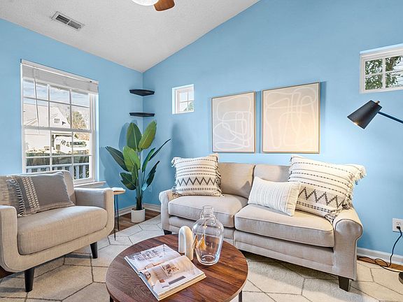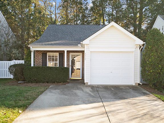 Charming home in an incredible location for under 300k! Can't beat it! 2 bedrooms with 2 full baths and a 1 car garage. New roof 2022, as well as updated flooring. Nice open floor plan between the living and dining areas, with a large sliding glass door that leads out onto the patio and fenced in back yard. All appliances convey. Very centrally located right between Raleigh and Durham. Roughly 8 min to Brier Creek, 15 min to new Apple campus, and 10 min to Umstead State Park. Don't miss it!