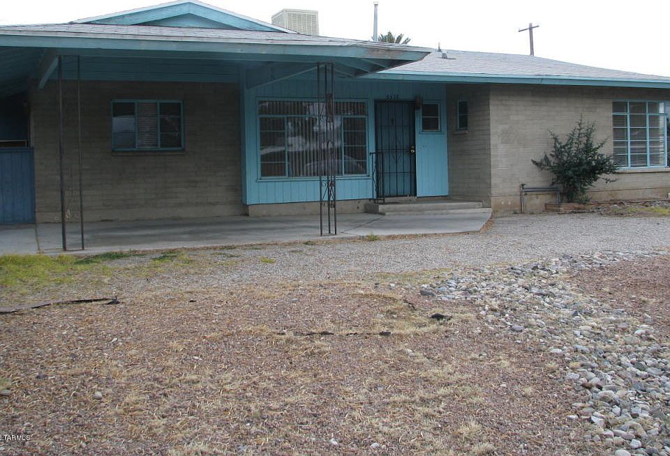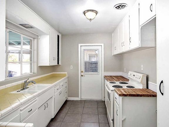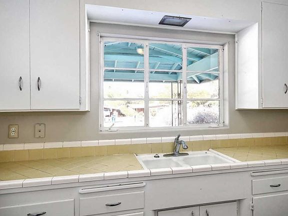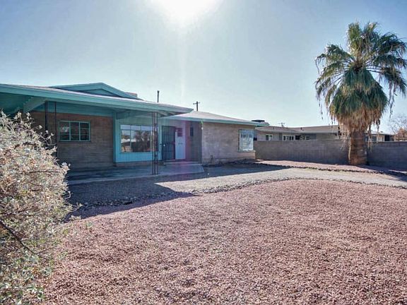 Charming 1950's Ranch Style Home with lots of character inside and out. Circular driveway! Fantastic retro kitchen features tiled counters, carport access, white appliances, tile floor, closet pantry, and white wood cabinetry with stylish hardware. Cozy brick fireplace, French doors to patio, soothing palette, and built-in china hutch in dining area. Plush carpet, ample closets, exterior laundry closet, and 2 baths. Spacious backyard with patio is a blank canvas for your future desert oasis.