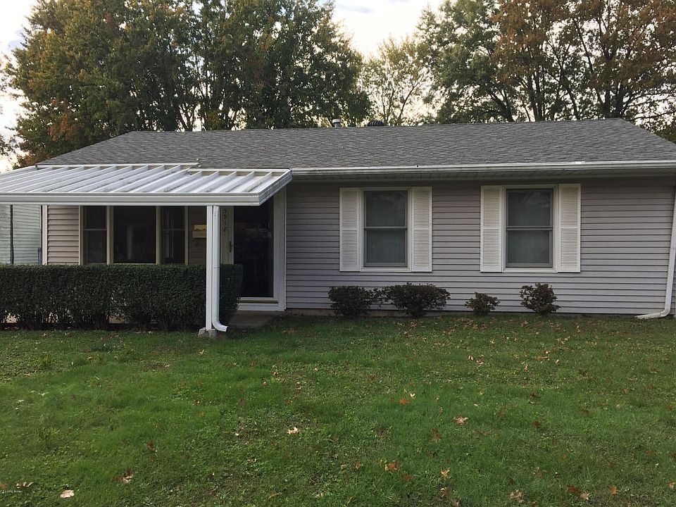 Nice starter home with excellent ''bones'' including newer roof with Gutter Guards, windows and doors, and insulated vinyl siding, covered front porch and large 2-1/2 car garage with its own breaker box. GuBack driveway is extra large for additional parking, patio, basketball court etc. Large fenced-in yard (wooden privacy fence) is great for the kids and/or pets to play. Backyard storage shed to stay with house as do kitchen range and (gas) dryer. Inside needs some minor cosmetic work (paint , etc.).