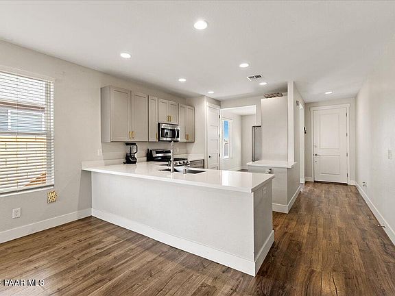 This professionally designed home features 3bd/2 bath/den/2 car garage & many upgrades with a open spacious floorplan. Kitchen boasts stainless steel Samsung appliances, elegant quartz counters w/a large peninsula, solid wood shaker style cabinetry w/soft-close doors & dovetail drawers w/full extension slides, handmade stainless steel sink & professional style faucet. Primary bedroom features spacious walk-in closet, raised height shaker style cabinet w/dual sink quartz countertop vanity, custom tile walk-in shower & private water closet. Guest bath features raised height shaker style cabinet with quartz countertop & cast iron tub w/custom tile surround. Laundry room is set up for full-sized stacked washer & dryer, quartz counter folding area, & storage cabinet. Outlast + Waterproof wood laminate flooring throughout all living area & bedrooms plus custom tile flooring in the bathrooms, recessed LED lighting throughout, raised panel 8' interior solid core doors, Milgard low E double pane vinyl windows with manufacturers lifetime glass break warranty, 9' interior ceiling height. 2x6 construction with full sheer construction, spray foam insulation, low VOC paint, tankless hot water heater, low maintenance synthetic stucco, insulated interior sound walls for quieter, more private living. Garage and garage door are both insulated. Front yard landscaping with automatic irrigation timer, paver driveway, walk way & patios. Privacy block wall in rear of home w/side yard gate, plus landscaped backyard with easy maintenance turf, pavers & raised flower bed along perimeter of privacy wall..Pergula from video does not exist (not included in sale)