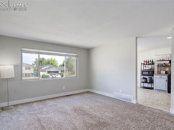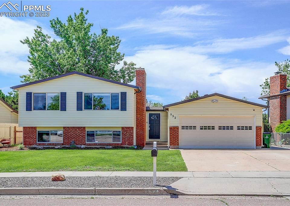 Bright and open bi-level on .18 acre cul-de-sac lot! This move-in ready home features…sunny 12 x 18 living room…refreshed eat-in kitchen with painted cabinets, new counters and faucet, all appliances included…lower level primary suite with 8 x 10 walk-in closet and gorgeous en-suite bath with double sinks and spa-like shower…two spacious upper level bedrooms, both with convenient access to the updated full hall bath…12x13 lower level family room with full wall white washed wood-burning brick fireplace…sunny 7 x 10 office space…good-sized laundry, with included washer and dryer. Outside, you’ll enjoy the…extra parking and large side gate… and covered 12 x 25 patio overlooking the large, xeriscaped, fully fenced backyard. Convenient access to military bases, Mesa Ridge Parkway shopping and dining, and I-25. Insulated garage with plenty of shelving, owned solar panels, radon system and central AC, too!
