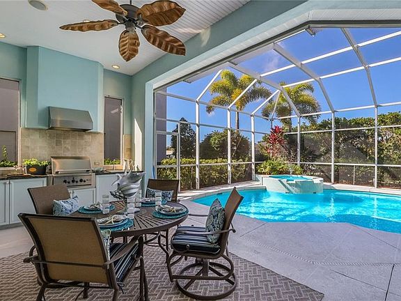 Arrive home by land or sea in this lovely three-bedroom plus den home in the stylish and convenient gated-boating community of Harbour Walk. Charming on approach, the Arthur Rutenburg Intrepid floorplan combines Key West-style architecture with a thoughtfully design open floorplan of tasteful finishes, including soaring vaulted ceilings with exposed wood beams, wood floors, transom windows and custom built-ins. Your premier location along a saltwater canal is enhanced with a spacious screened pool terrace connected to the main living area and master suite via glass sliders. Here, you'll enjoy sweeping water views complemented by a large pool with sun shelf and spa, full summer kitchen and a covered area for dining alfresco or simply finding a bit of shade. Entertaining indoors is just as fun. Host guests in the main living area with fireplace and built-ins and converse in the adjoining chef's kitchen with stainless steel appliances, stone surfaces, command center and abundant light cabinetry. A formal dining room is perfect for grand affairs. Retreat to the spacious master suite to reinvigorate the spirit with a large bath featuring Whirlpool soaking tub and separate walk-in shower. Two additional bedrooms are generous in size for family and guests, and a den welcomes game day celebrations, hobbies or remote work. Explore natural scenery, fishing spots, and more by launching from your private boat dock with space for a large vessel, a lift for your smaller vessel, along with room for your jet skis. Direct access to the Gulf of Mexico and beyond is achievable right from your own backyard. Among its incredible amenities, the community boasts a guarded gate, nature trails, a fishing pier, canoe launch, tennis courts, playground, and picnic area. No CDD Fee.