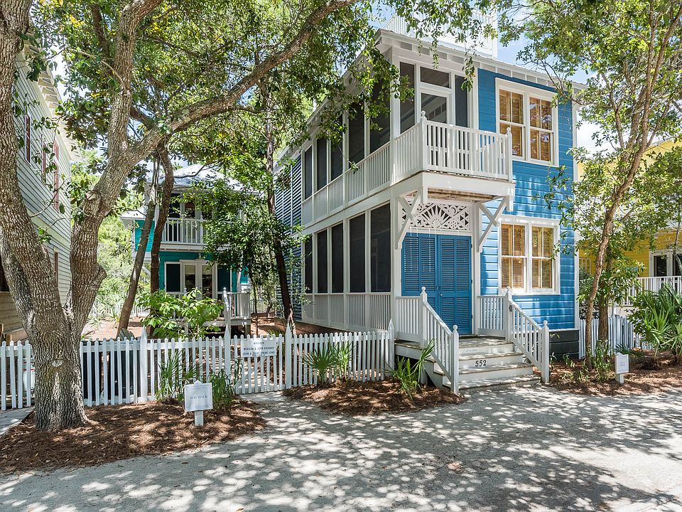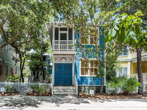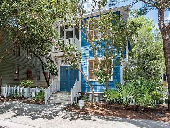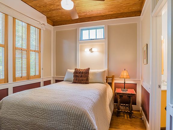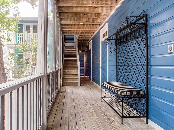Main Cottage (715 sq ft) - 2 bedrooms, 2½ baths / Guest Cottage (436 sq ft) – 1 bedroom, 1 bath Richard Gibbs selected this lot and designed a main cottage with guest cottage for his personal residence during his tenure as Seaside’s town architect. The cottages are surrounded by a grove of oaks on a quiet lot overlooking Forest Street Park. The embellished screened porch runs the entire length of the main cottage. Two bedrooms with private baths, along with laundry room are located on the first level. An outdoor shower is tucked under the stairway that leads up to the second floor. The great room is the true heart of the cottage. Interconnected living, dining and kitchen areas offer easy living. The dramatic raised ceiling with exposed cypress beams adds volume allowing sunlight to cascade into the cottage from the side porch windows and door. Interiors colors are warm and inviting with comfortable furnishings. A built in desk with bookcase is flooded with soft sun light from the bay window. Take a midday nap in the hammock or have an intimate dinner on the upper porch. The kitchen is located at the rear of the cottage with a tall bank of windows perfect for watching an array of native birds passing through. Continue up the spiral stairs to the widow’s walk with the most astounding views in town and is a perfect perch for watching shooting stars. The separate guest cottage continues with the magical playfulness of the main house but with its own personality. The cottages are built with time tested materials.
