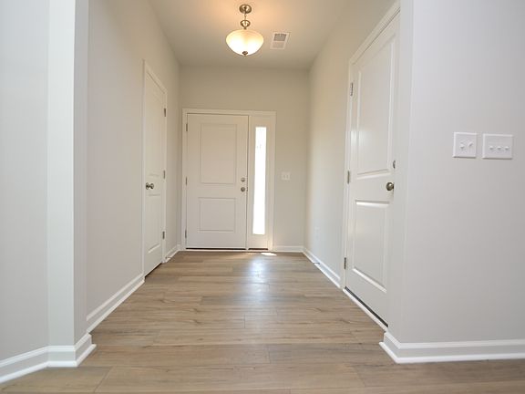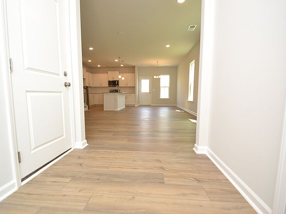This brand-new end unit townhome is ready for immediate occupancy and located at the gateway to Raleigh in the new Exchange at 401 planned community. Its prime location puts you within minutes of downtown Raleigh, the new I-540 connector, Cary, I-40, local parks, retail and more! Arrive in your private driveway and a covered front porch welcomes you inside where you're greeted by a surprisingly-large, open-concept floorplan that lives perfectly for today's lifestyle. Tall, 9' ceilings allow natural light to accentuate the home's lovely interior; including the beautiful luxury plank flooring that graces the entire main level. That's right, no carpet downstairs! The first floor is anchored around an amazing kitchen featuring a suite of sleek stainless-steel appliances (including a gas oven), timeless, white Craftsman-style cabinetry, a pantry, thick granite counters and an impressive island with an undermount sink and breakfast bar area that works perfectly for casual meals. The adjacent dining area seamlessly intereconnects the family room with the kitchen. The family room is extraordinarily spacious and is designed in a manner that makes furniture placement a breeze. You'll surely appreciate the recessed LED perimeter lighting and the dramatic, exposed staircase clad with hardwood treads. Before heading upstairs, be sure that you don't miss the attached garage with direct interior access; never again will you have to unload groceries in the rain! On the second level you'll find all three bedrooms as well as a conveniently-located laundry room with a brand-new washer and dryer that will be provided for resident's use. The sprawling primary bedroom boasts triple windows, a tray ceiling, recessed LED perimeter accent lighting, a walk-in closet and an en-suite bathroom complete with dual sinks on an elevated and elongated quartz-topped vanity as well as an over-sized, tiled, walk-in shower with a bench and a glass enclosure. Bedrooms #2 and #3 are both generously proportioned with ample closet space and enjoy easy access to a full hall bathroom; also with a quartz-topped vanity as well as a tub/shower.