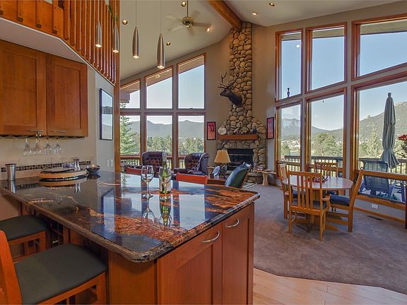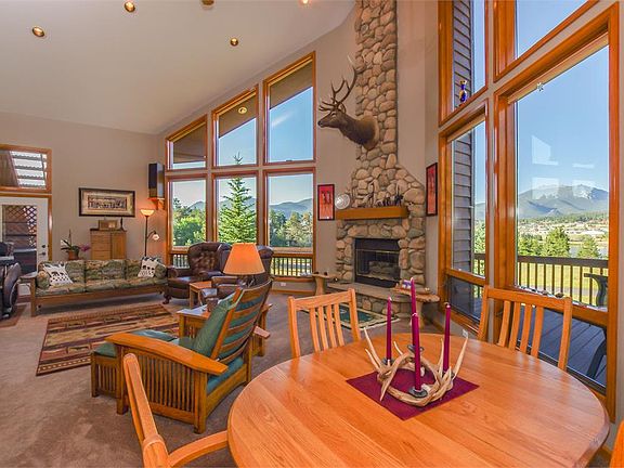 Location, Views, Location. Custom built by the reputable Dallman Construction on an estate lot this home has exquisite views of Twin Sisters, Lake Estes & Continental Divide. Located only steps from Downtown, Lake Estes, Safeway, restaurants, golf course & trails. Features include 20 ft. vaulted ceiling, spacious kitchen with SST Appliances, Cherry cabinets & Brazilian slab granite counters, Hickory floors, Radiant in-floor heat in master bath, large master suite, sauna, hot tub,Central AC, etc. 576 Sq Ft over-sized garage + Carport and RV Parking area. NO WATER INTRUSION DURING 2013 FLOODS.