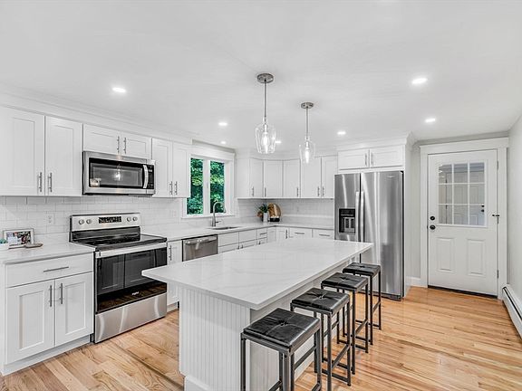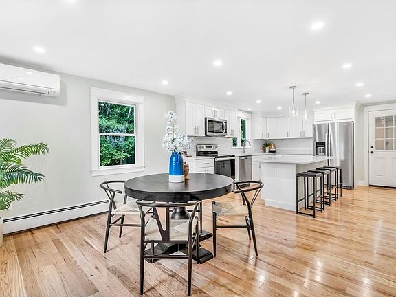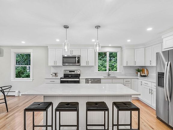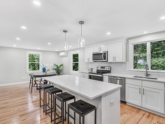 This newly renovated Cape has it all. Beautiful kitchen with Quartz counters, island, stainless appliances. New hardwood floors throughout the house. Bedroom one is on the first floor or can be used as a private office, next to the newly renovated full bath. Wood fireplace and bay window in the spacious living room. Five mini splits for heat and a/c. Upstairs, another newly finished tiled bathroom. The second bedroom has lots of storage space and natural light. Bedroom three includes a walk- in closet. The finished basement allows ample space for a workshop and recreation area. Wall mounted Buderus boiler for efficiency, new roof, windows are insulated, spacious two car garage with EV charger. The heated breezeway from the garage is a perfect spot to relax and enjoy nature. Brand new paved driveway.