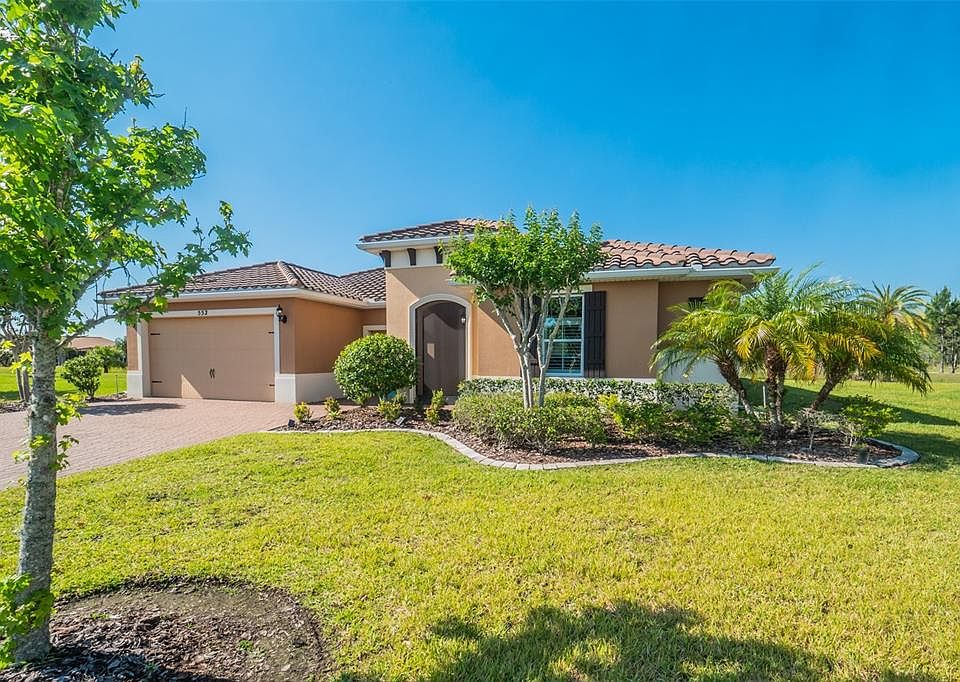 ***HUGE PRICE REDUCTION*** Welcome to the tranquil neighborhood of Solivita, a 55+ gated community with 24/7 guards. This is a lovely house on a professionally landscaped lot on a cul-de-sac, close to the village, community pools and many amenities offered to Solivita residents. This house offers 3BR 2.5BA 2CG, a golf cart garage, with a bonus room/den for extra guests or an office. It comes with hard wood floors, ceramic tiles, crown molding, with High impact windows, just to name a few. You will also find access to the enclosed lanai through sliding doors in the living room. The kitchen features stainless steel appliances, granite counter tops and 42" wood cabinets with plenty of drawers for easy storage. The Master bedroom has a trey ceiling and crown moldings, . This house is in excellent condition and is move in ready. Room Feature: Linen Closet In Bath (Primary Bathroom).