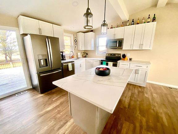 Own your own slice of absolute country in this renovated home! Home sits on 1.5 acres surrounded by corn fields, pine trees and nearly 2000sq ft of residence. This 4BR,2BA has tons of upgrades. Upper level has a beautiful open concept kitchen/dining/living room area. Totally new kitchen with awesome quartz counters, vaulted ceilings, new slate appliances, gorgeous cabinets and a large island which has plenty of room for stools and perfect for gatherings. Off the dining area there is also a walk/in pantry and patio doors to a large deck overlooking the large yard and fields. Each level has beautifully remodeled bathrooms(one has a walk/in ceramic tiled shower). New carpets, new floors, lots of new windows and so much more. Detached 2.5 car garage, storage shed, large rear deck, lots of trees. Home was gutted to studs with new electric, new well! Close to schools but most importantly: COUNTRY LIVING! Come check it out!