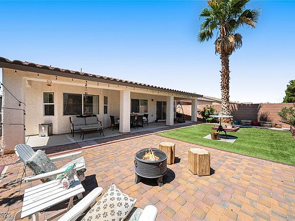 Welcome to your stunning 3 bedroom Mountain Falls home, perfectly situated with no rear neighbors and backing up to the parkway! Why buy new when you can enjoy a beautifully landscaped yard with grass turf, planter, roses, a mature palm tree, pavers, and an oversized covered patio? Step into an inviting open living concept, where the lovely kitchen flows into the family and dining areas—ideal for entertaining! The split floor plan ensures privacy for everyone. The primary suite is a true retreat, featuring a cozy sitting nook and a spacious walk-in closet, while the bathroom offers dual sinks and a walk-in shower. This home also includes fantastic extras like a Nuvo H20 whole house water system, ceiling fans, blinds, and a mix of engineered wood and carpet flooring. Plus you're just a short stroll from the clubhouse! Don’t miss the amazing amenities in the Mountain Falls community, including pools, a spa, gym, golf course, restaurant, and parks—all just an hour from Las Vegas!