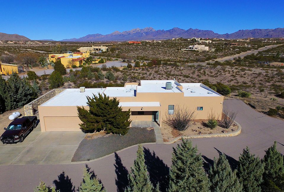 Experience High Desert Living! Southwestern-style home on spacious 5.0 acre home site. Broad panoramic views of the Organ Mountains & Mesilla Valley. 3 BEDROOM, 3 BATHROOM, approx 2,027 sqft. LIVING ROOM features large picture window on view side, custom flooring & ceiling fan. KITCHEN offers eat-in dining area, wood cabinetry, BOSCH dishwasher, electric range & skylight...easy to access patio. Huge MASTER BEDROOM with fan. Double MASTER BATHROOMS with tile flooring, walk-in closets & skylights...one has a jet tub & other has a shower. Tiled FORMAL DINING area. Full Hall BATH with tile flooring & tile tub surround. UTILITY ROOM with extra cabinet storage. OVERSIZED insulated 2-Car GARAGE/WORKSHOP (approx 817 sqft), has it's own evap cooler & utility sink. Comfortable refrigerated air/security system/water softener/upgraded built-up roof. Covered BACK PATIO with swing, water feature & Pergola...watch the mountains turn colors! Horses allowed, lots of possibilities for your corral/barn