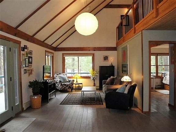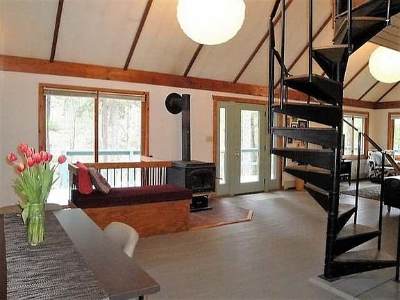 This year-round, Rhinelander Chain home with 386' of frontage is located on a wooded 2 1/2 acre cul-de-sac lot. The contemporary, open concept design has vaulted ceilings, a wood-burning stove & wood plank flooring. The main level features a spacious living room, huge 4-season sunroom, updated kitchen, master bedroom & a full bathroom. A spiral staircase leads to 2 bedrooms, studio & full bathroom. This home has a basement, drive-under garage, carport & wrap-around deck.