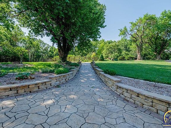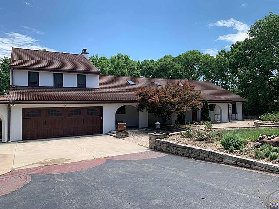 Welcome to your own private subdivision on 10.84 acres located just North of Topeka city limits. It is private, secluded but not isolated in the North Country Estates west of Hwy 75 off Brickyard Rd. As you entry the drive, the architectural design and steel roof gives you a Spanish villa feeling. You notice the outbuildings, fenced orchard/garden, Paw Paw patch and stunning landscaped courtyard. The 1.5 story home is a "universal design' meaning you can age in place at any age. Entering you notice the zero entry, a splash of natural light, the hardwood floors, and large windows blanket the rear of the house offering a view of the pond and wooded acreage with trails. The main level is open with high vaulted ceiling's, wide doorways, 2 bedrooms, 3 baths, 2 remodeled kitchens-viking gas stove, trash compactor, wall oven, cooktop and 2 sinks; Primary bedroom has 2 full baths and a den or art studio, enclosed porch, gas fireplace, laundry & elevator to the basement. Upper level suite designed for overnight guest with full bath and sitting area. The walkout basement has a full kitchen, rec room, 4th bedroom suite & bath, 5th bedroom/office no egress window and ample storage. Attached 2 car garage with storage area and whole house generator. The 38x38 outbuilding is a dream garage with sunken RV parking space, tons of shop area, main level 2 car parking, it's heated, has hot & cold water, set-up for air compressor and shop vac. A one of a kind property that you are sure to love.