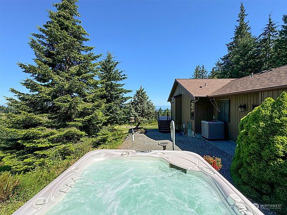 Stunning water view of the Strait of Juan de Fuca. Come and see this amazing oasis set in the foothills of Port Angeles. So many great features: Cathedral ceiling in living room and great room, soaking tub in the primary bath, steam shower in the shared hall bath, 400 amp service with a separate panel to add generator, on-site well with 1000-gallon holding tank, newer stainless steel appliances, Hot Springs hot tub outside, 2-way propane fireplace between living room and great room, propane hot water heater (home also plumbed for gas range and dryer), hard-wired CAT5 for internet. Home exterior professionally painted in 2023. Combined over 2000 square feet of garage parking, large RV garage parking and heated shop with sink.