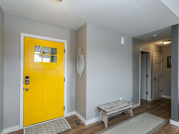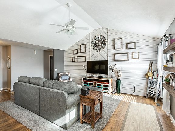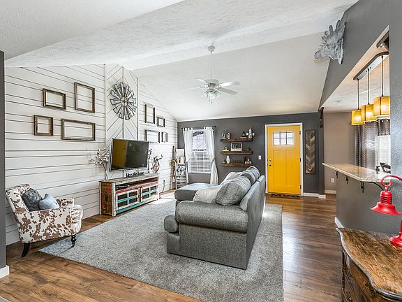 This beautiful home greets you with a covered front porch and open floor plan! Big living area with vaulted ceilings, upgraded wood laminate floors in living room, kitchen and hallway. Huge kitchen with bar area, granite counter tops, tons of cabinets and all appliances stay including refrigerator! Master bedroom with recessed ceilings, his/her walk-in closets, and double sinks. Several amenities to mention: Solar panels with warranty, new screen doors on front and back doors, large laundry room with shelving, fenced yard with fire pit and storage shed.