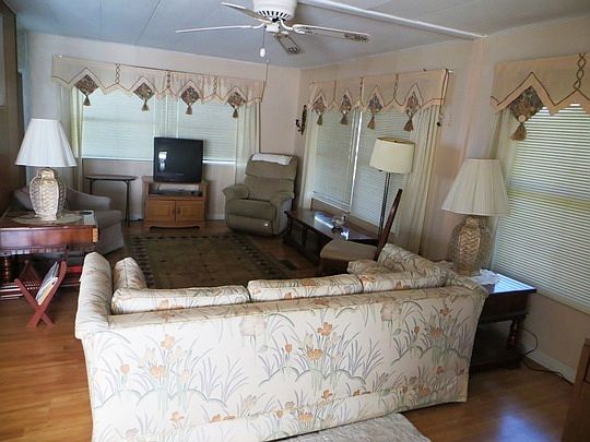 This lovely 2 bedroom, 2 bath doublewide mobile home is located in Betmar Mobile Home Park where you own the lot. As you enter the home off to the left is your large great room which leads to the open living area & dining room. The kitchen comes with built-in oven, separate cooktop, dishwasher, microwave and refrigerator. The master bedroom is a good size with attached bathroom with shower. There is laminate wood throughout except in the wet areas and kitchen where there is vinyl. The sliding doors off the dining/living area go into the glassed-in Florida room. There is also a door from the Florida room that leads out to a screen room. Just imagine what a nice place this will be to relax and take in the Florida sunshine. Come enjoy all that this community has to offer with its 27 holes of golf, tennis courts, 3 clubhouses, shuffleboard, and many clubs and activities. Call for your private tour today.