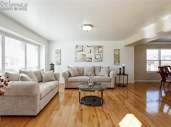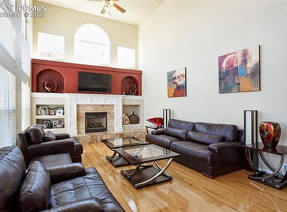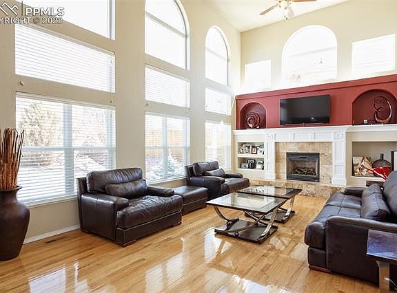 Prepare to be welcomed by terrific south-facing curb appeal along with gleaming oak hardwood flooring and soaring ceilings as you arrive at this wonderful 4 bed / 4 bath / 3 car fully finished two-story home with mountain views ~ located in highly desirable Indigo Ranch at Ridgeview * The open, spacious main level floor plan makes this home perfect for entertaining and large gatherings & includes a formal living room ~ large dining area ~ huge kitchen w/pantry, maple cabinetry, gas cooktop stove, breakfast counter bar, stainless appliances & Corian counters in addition to an amazing family room w/20' ceilings ~ a wall of windows allowing for lots of beautiful natural light to pour in ~ gas fireplace w/carved wood mantle plus custom built-ins for audio-visual and decor showcasing * Upper level includes a huge primary suite w/hardwood floors, vaulted ceilings and French door access to large, tiled 5-piece bath w/soaker tub, dual vanity & walk-in closet * Two additional bedrooms along with semi-circle balcony overlooking main level great room & kitchen area complete the light and bright upper level * Lower level offers a fully finished basement w/9' ceilings ~ huge recreation room ~ large 4th bedroom w/walk-in closet and a private full bath & storage area * Additional property features include space for storage in the oversized 3-car garage ~ ceiling fans & AC ~ window blinds & plantation shutters ~ large lot ~ fenced yard ~ a large concrete patio for those summer BBQs ~ and mature custom landscaping front and rear * Easy access to Peterson ~ Schriever ~ shopping and services !