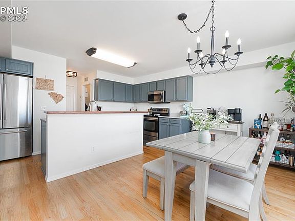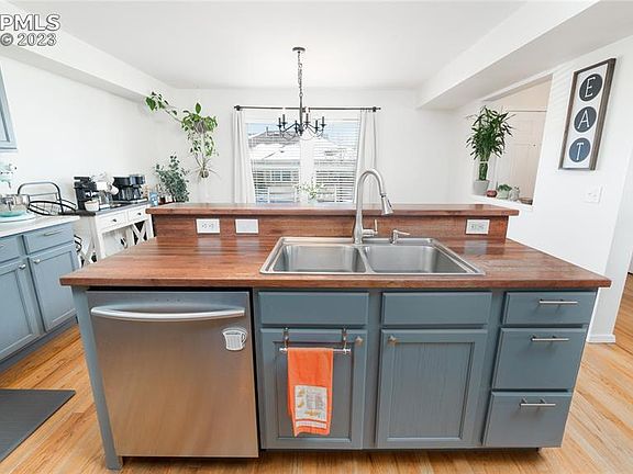 Move right in to this easy-living community with all appliances included, you're all set! Quaint porch welcomes friends and family. Hardwood floors grace the entire main level (except laundry). Inside enjoy a beautifully updated powder bath and kitchen with quartz and butcher block counters, painted cabinets, updated lighting and hardware, and all stainless appliances. Eating area is huge, with ample space for beverage carts or bonus cabinets. Main level living room includes wood floors and a slider door to patio / yard area. As one of the larger 2-story plans in the community, enjoy bonus family room/loft (and owners are happy to leave large sectional couch). Three bedrooms are up, and 2 baths... the owner's suite has a walk-in closet and luxuriously upgraded shower and double vanity. The community includes alley load garages, small fenced yards, and quick access to Marksheffel for easy commutes to local military installations, and the Powers corridor for dining and shopping!