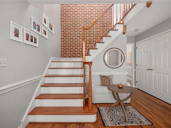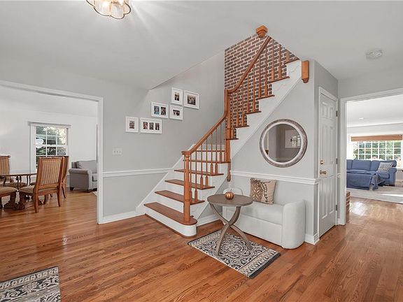 • Description: Hardwood Floors, Chair Railing, Chandelier, Brick wall along staircase with two recessed lights