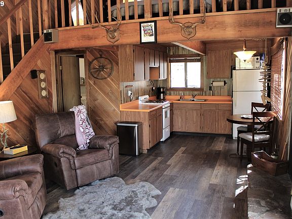Comfortable & cozy 885 sf cabin, newly remodeled inside & out. Loft B/R, main B/R, full bath, full laundry, great roomw/kitchen, original wood burning fireplace plus new propane fireplace, new stove & tank-less water heater. Back deck w/mature pines & view of Mt. Jeff & Hood on 5.8 acres. New covered front deck. 20X24 pole barn for toy storage. State of theart solar system w/new 8/19 16-L16 batteries. Move-in ready.