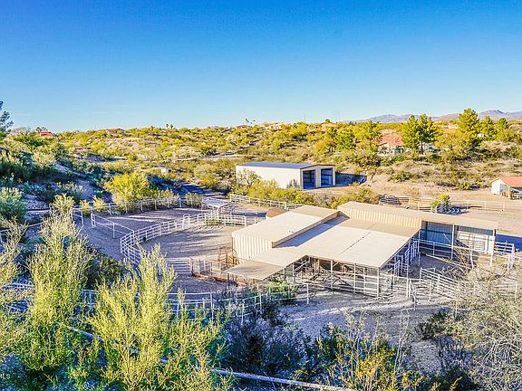 Hill top gem! This home has some of the best views in Wickenburg. Bring your horses, Lounge by the pool and enjoy life! This stunning home has plantation shutters throughout, beautiful custom cabinetry and wood floors. The kitchen is bright and open with newer white appliances to match the countertops and custom backsplash. The fully fenced backyard has a screened in sun room, crystal blue diving pool and magnificent mature palm trees. There is a separate detached 2 car garage with extra storage room. The home also has owned solar panels. Down at the horses, you will find extra tall pipe fencing, a hay/tack barn, hot walker, covered RV/horse trailer parking and plenty of room to turn out your horses. You really don't want to miss your opportunity to own this amazing home in Wickenburg