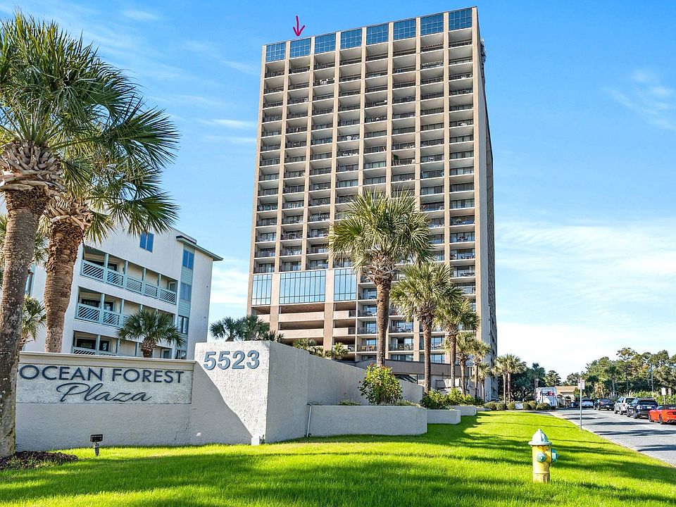Welcome to Luxury! This exquisite Ocean Front Penthouse Condo that is centrally located in the heart of the Ocean Forest section of Myrtle Beach South Carolina! This 2-Story fully furnished Penthouse is situated on the 23rd and 24th floors in the prestigious Golden Mile section. Freshly renovated, 1,430 sq ft, 2 bedroom/2.5 bath condo offers breathtaking ocean front views. As you enter the first-floor kitchen it has exquisite marble countertops, soft close cabinetry, sophisticated high-end lighting / plumbing fixtures, stainless steel appliances, white subway tile and a breakfast bar. The downstairs continues with a dining area and an adjoining living room with a floor to ceiling sliding glass window wall that opens onto a private balcony, overlooking the majestic Atlantic Ocean. The lower level has new wall to wall waterproof wood-look luxury vinyl plank flooring. The upper level has 2 oversized bedrooms, each with its own bathroom. The 14’ x 19’ primary suite has its own ocean front view with a vanity area with sink and closet. As you enter into the bathroom it has a tiled standing shower with frameless glass shower enclosure. The spacious second bedroom overlooks Pine Lakes Golf Course with beautiful southern sunset views. The upstairs has wall to wall marble flooring. New area rugs are throughout the unit. This luxury condo is perfect for a primary residence, second home or for a vacation rental investment. Ocean Forest Plaza allows for short-term and long-term rentals. Owners are allowed pets and golf carts. This high rise features wireless WIFI, owner’s fitness room, 7th floor owner's oceanfront lounge, back sunset patio, owners and guest laundry rooms, heated indoor pool, hot tub, sauna and outdoor pool. HOA fees include interior electric, water, cable and WIFI. This unit has separate central heat and cooling systems for each floor. Ocean Forest Plaza is not only located in The Avenues area of Myrtle Beach, it is close to everything you could want! After spending the day on the beach building sandcastles, surfing or just soaking up the sun, you are minutes away from endless restaurants from exotic to traditional, golfing, shopping, miniature golf for the family, and the Award-winning Carolina Opry! This immaculately maintained luxury condo is ready for you to make memories to last a lifetime!