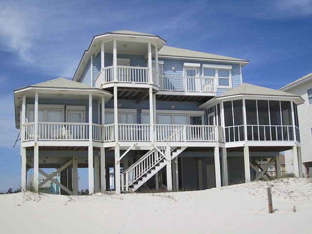 GULF FRONT BEAUTY! Custom Built.Unique shaped Trex decks-open, covered & screened.Makes for absolutely beautiful Gulf Views.Large Open Liv/Din/Kit w/eating bar.Well equipped kitchen w/lots of countertop space & flat top range.Office w/hidden desk/work area/study/extra bedroom.Five Large Bedrooms w/3 Gulf Front/4Baths w/1/2 bath downstairs.Tray Ceilings.Bahama & Hurricane Shutters.Lots of Storage.