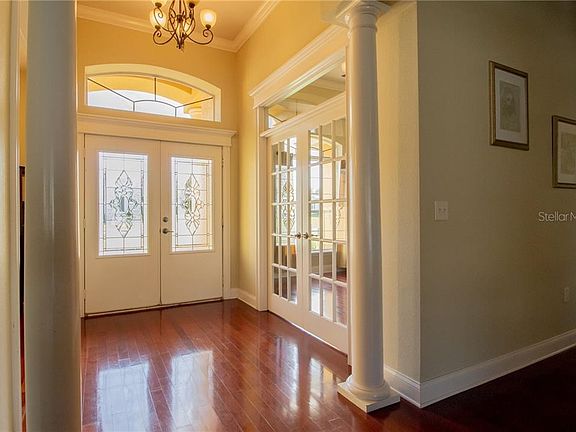 This lovely, well maintained 4/3 triple split plan features 10ft. ceilings, an open living area with wood floors, wired for surround sound, built in entertainment center and a gas fireplace. French doors with built in blinds lead out to the private paved lanai and large screened in pool area. Great for entertaining and family gatherings! It also includes an office/ den with french doors and a formal dining room, both with tray ceilings and wood floors. This home has a large eat in kitchen with stainless steel appliances, breakfast bar and pantry. The split bedroom plan provides privacy for the master bedroom on one side while the other 3 bedrooms and 2 baths are on the opposite side of the home. The 2 bedrooms have a bathroom in the hallway between and all can be closed off with a pocket door and the 4th bedroom has a separate bathroom and both can be closed off as well and has a french door leading out to the pool area. Spacious master bedroom also has french doors leading out to the lanai, the master has a "spa like" master bathroom with dual sinks, garden tub, separate shower and walk in closet. Fenced in yard, side car garage and paver driveway. Established North Lakeland gated community with sidewalks and street lights! Close to I-4, shopping, and restaurants. Beautiful home and peaceful community. Schedule your showing today!