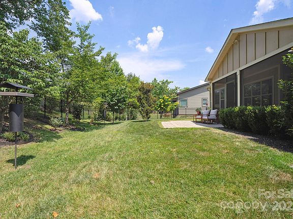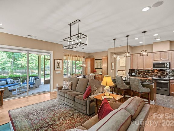 Make yourself comfortable & enjoy this open concept home with a rocking chair front porch that flows seamlessly from in to outdoor spaces. Great room with a stunning fireplace wall in venetian plaster flows seamlessly through the rolling wall of glass to your oversized screened Lanai, entertaining areas & backyard oasis. Eat in Kitchen features SS appliances, granite countertops, breakfast bar plus a tile backsplash. Dining area adds additional cabinetry & serving/bar area for extra storage. Primary suite has a bump out bay window adding space and highlights the private rear fenced yards park like setting. Ensuite bath w/dual sink vanity, large shower & a generous custom walk-in closet. 10' ceilings & 8' doors. Wood & tile in main living area, upgraded carpentry in primary and guest bedroom. 2 car garage w/4' extension and large cabinets for extra storage. Walking distance to the Twin Mills Club. Trilogy Membership includes Freedom Boat Club on Lake Norman plus award winning amenities.