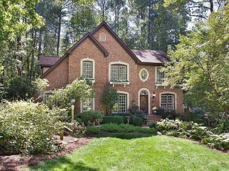 STYLISH and INVITING Storybook in Wake Forest! Very private ONE ACRE cul-de-sac with wonderful formals, 9 ft. ceilings and site-finished hardwoods first floor, MASONRY FP, and light-filled kitchen. Spacious primary, all beds w/connecting baths, fresh paint, newer roof (2019), fabulous VERANDA (easily screened) and all overlooking a magical setting of gardens, stone walkways & layered hardscapes . . . and all so convenient to downtown Wake Forest and the Triangle's finest!!