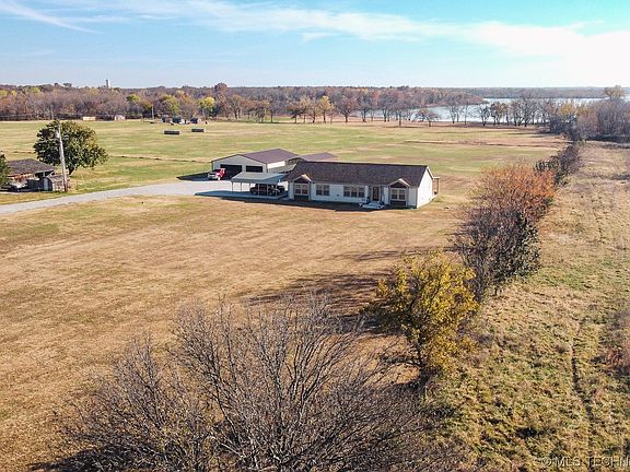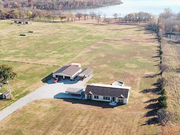 Welcome to your very own slice of paradise on the stunning shores of Grand Lake, Oklahoma! This breathtaking 3 bed 2 bath property has stunning lake views, boasts five acres of pristine land, a semi inground pool, covered patio area perfect for entertaining and enjoying lake life, detached 3 car garage metal shop w/ electric, RV carport parking and hookups and additional carport parking. Step inside a 2021 built home that offers both luxury and comfort, to discover a beautifully crafted space with modern finishes and a light-filled interior. The open concept living area seamlessly flows into the dining area and the stunning kitchen, with a sprawling island, complete with custom cabinetry w/ soft close, top-of-the-line LG appliances, fridge has 2 ice makers, oven w/ air fryer, walk in pantry and sleek countertops. The main bedroom is spacious with windows showing off a beautiful countryside view. The main bathroom impresses with a walk in tile shower w/ seating, soaker tub and large main closet. The two guest rooms are spacious with ample closet space, the guest bath has two sinks and opens to utility room. Furnishing are negotiable, storage containers can be purchased. This property offers easy access to all the amenities that the lake has to offer, including marinas, restaurants, and shopping. Agent related to seller.
