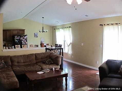 BETTER THAN NEW! Immaculate ranch constructed 3 years ago. Split and open floor plan gives this home a spacious feel. Upgrades include laminated flooring in great room, upgraded tile, light fixtures and hardware on interior doors. All bedrooms have walk in closets. Privacy fencing in back yard great for pets, play area or entertaining. Nicely landscaped. Laundary room/mud room allows for access to house off of 2 car attached. Roof and privacy fence are new.\n\nInformation Deemed Reliable But Not Guaranteed. Information provided by the Southern Indiana REALTORS® Association, Inc. © 2010 SIRA Multiple Listing Service. All rights reserved. Brokered And Advertised By: Semonin REALTORS®, Inc. Listing Agent: Patricia Adams