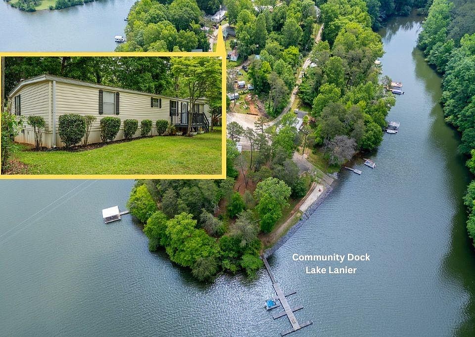 BACK ON MARKET AT NO FAULT TO SELLER! Welcome to your lakeside escape! This cozy, well-maintained mobile home is nestled in a serene gated-lake community, offering stunning seasonal views, peaceful surroundings, and endless recreational opportunities. Situated just steps away from the shimmering waters of Lake Sidney Lanier, enjoy fishing, boating, kayaking, paddleboarding, or simply relaxing by the shore. The community features a clubhouse, picnic tables, tennis courts, a community dock with boat slips, and organized events for residents. This home features 3 bedrooms with spacious closets, providing plenty of space for family or guests, 2 full bathrooms with modern fixtures, a fully equipped kitchen with updated appliances and a gorgeous butcher's block countertop. Enjoy morning coffee or evening sunsets on the expansive deck area. Your move-in process has been simplified with fresh paint throughout, clean carpets, newer plumbing, newer roof, and newer electrical work, you can instantly start enjoying everything this home has to offer. This property includes an outbuilding for golf cart storage and a camper storage unit. There is ample parking space for multiple vehicles or a boat. Take advantage of this rare opportunity to be part of a vibrant lake community at an affordable price. It is conveniently located with just a short drive to Murrayville, Dawsonville, Dahlonega, and downtown Gainesville. Don't miss out on making this your peaceful retreat by the water! Whether you're seeking a weekend getaway or a permanent residence, this home provides the perfect balance of comfort and outdoor adventure. Schedule your tour today!