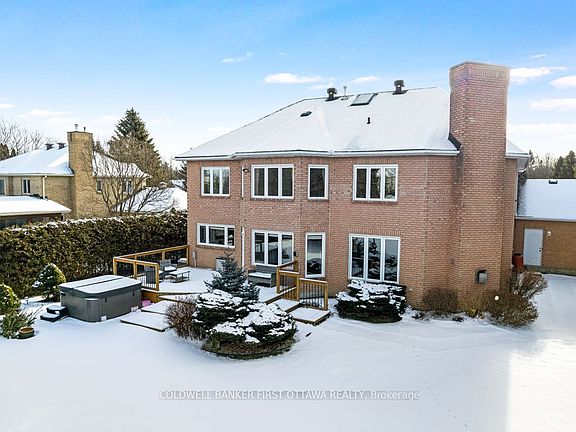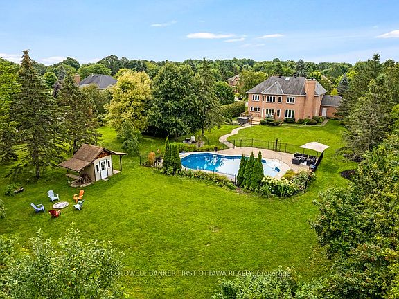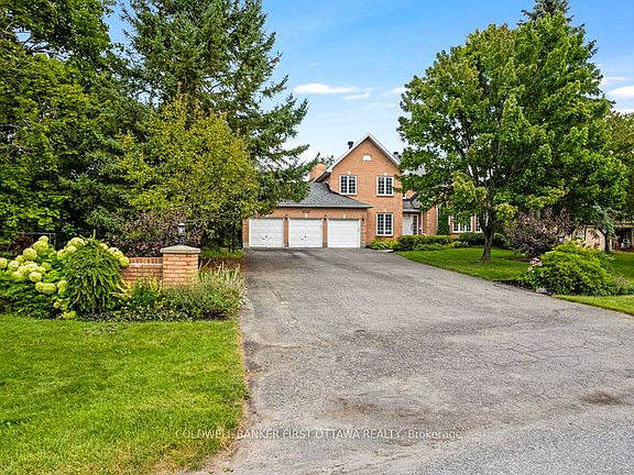 Gracious home for the family wanting to live on quiet treed crescent where you can walk to a park for play, basketball and hiking. Along with its idyllic setting, this home is designed for the family desiring big rooms, sunny spaces and generous bedrooms - including five bedrooms on the second floor. Lovely landscaped interlock walkway leads you to front entrance with sparkling white foyer offering closet and new ceramic floor. Home has 4,349sf, plus 2,328sf in finished lower level. Off front foyer is home office or, den for quiet times. Elegant vaulted living room with natural light flowing thru grand arched window. Formal dining room for family celebrations and entertaining. Ultimate gourmet kitchen all renovated & upgraded in 2024 with new quartz counters, new appliances and deluxe island-breakfast bar. Kitchen also has dinette in windowed alcove with garden door to deck. Spacious comfortable familyroom features natural gas fireplace. Main floor powder room plus combined mudroom-laundry room with closet, storage cupboards, sink and window. Sweeping central staircase up to wide circular landing on second floor. You'll love the palatial primary suite with its custom walk-in closet-dressing room with big windows; your luxurious 5-pc spa ensuite has double-sink vanity with cascading quartz counter, deep soaker tub and glass shower with body spray. Four more bedrooms, one with 3-pc ensuite. Second floor 5-pc bathroom has porcelain tiles, double-sink vanity, soaker tub plus glass rainhead shower. In the finished lower level, you have another family room, rec room, den, kitchenette/bar, gym and 3-pc bathroom. The attached 3-car garage is insulated and finished. Auto generator included. Backyard oasis a family's staycation dream with private park-like 0.7 acre bordered by mature trees. Expansive deck includes hot tub. Added bonus is heated, salt-water, in-ground pool. All this, located in prestigious family-friendly Manotick Estates, just 30 min drive to downtown Ottawa.