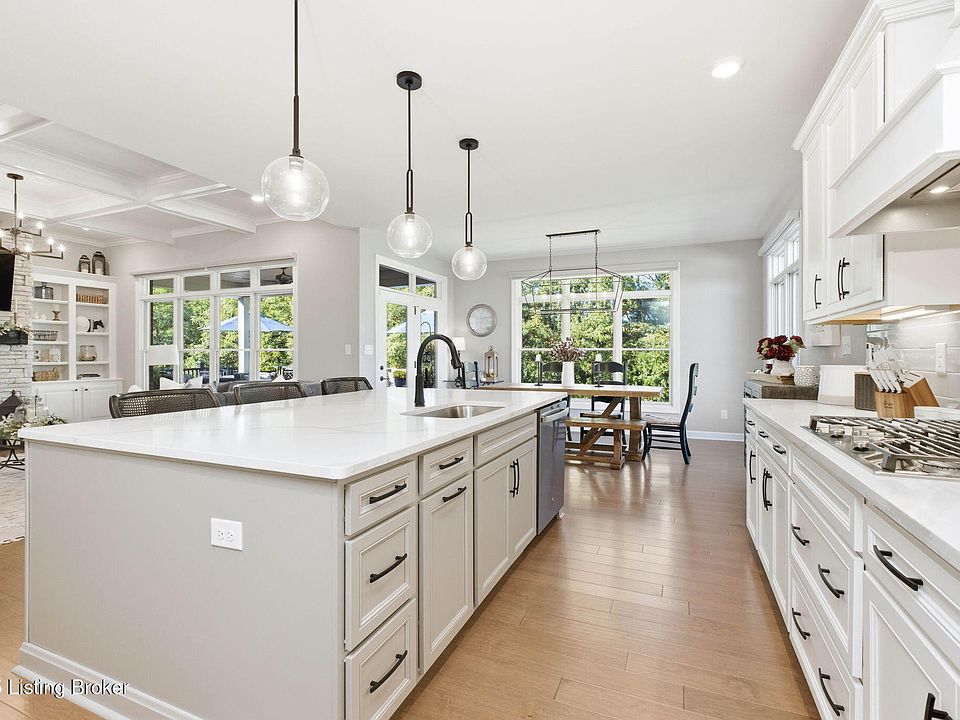 The gourmet eat-in kitchen is a true showpiece, showcasing upgraded quartz countertops, high-end stainless-steel appliances, a custom wood range hood, designer lighting, and a spacious walk-in pantry. Additional transom-topped windows bathe the space in natural light, creating an inviting atmosphere perfect for both everyday living and entertaining.
