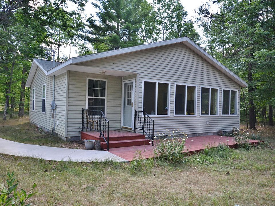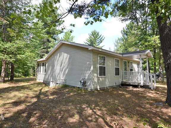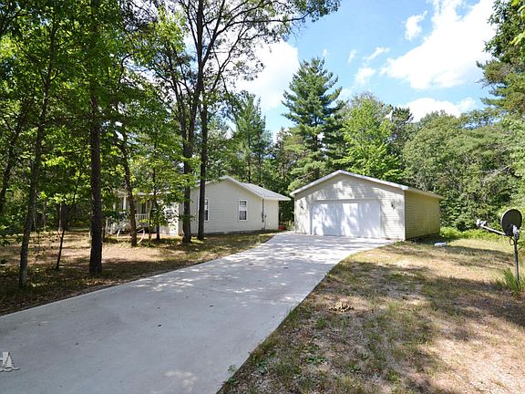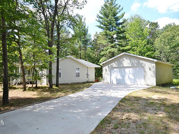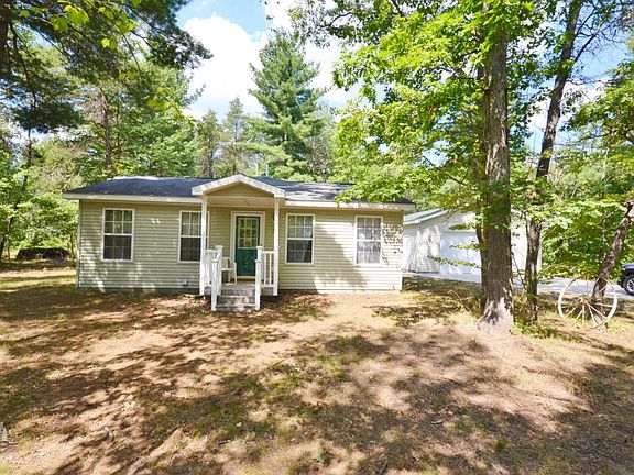 This property is a wonderful starter home or good for retirement. 2 bedrooms, one bath and living/dining and kitchen combined. Drywall interior Convenient laundry off large year round sunroom for extra living space. Also, a large 24x32 detached garage with paved driveway. 2 nicely wooded lots on a corner with state land across the street and a short drive to Tee Lake access.