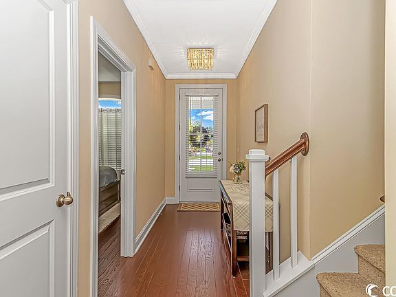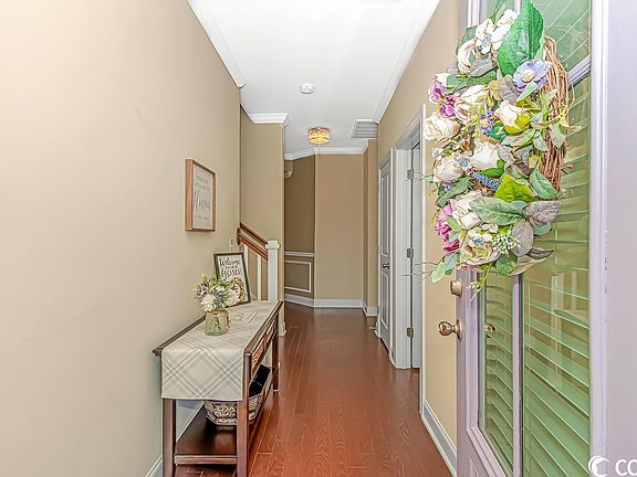 Stunning end unit! The Brookhaven floor plan in Tuscany is a two-story townhome and has 3 bedrooms, 3 baths, and a 2-car garage. Approaching the front of the home, notice the custom paver patio beside the front porch, hurricane shutters, custom landscaping, and a wonderful large front door entry. Enter the home to find showstopping engineered hardwood throughout the main level, high and vaulted ceilings, crown molding accents throughout the home. A formal dining room showcases beautiful chair molding and showbox accents. The stunning kitchen boasts granite countertops with matching island, gorgeous dark cabinetry with ample storage, and is open to the living area that has a vaulted ceiling. The large owner’s suite features private access to the screened porch, vaulted ceilings, a large bathroom with a double sink vanity, and step in shower, as well as a walk-in closet that has a pull down to the attic. The guest bedroom, with oversized closet and guest bathroom are on the first floor as well. Walk upstairs to a private guest room with a full bathroom, and access to over garage storage. The oversized 2 car garage offers additional storage shelving as well. This property includes a gas tankless water heater. Enjoy a cup of coffee or evening cocktails watching breathtaking Carolina sunsets on the custom paver back patio or the large screened in porch, that has a view of the pond. The Tuscany community offers a resort lifestyle year-round! Tuscany residents have access to the resort-style amenity center which features a two-story clubhouse with two outdoor swimming pools, lazy river, 2,000 square foot state-of-the-art fitness center, game room, 24-seat movie theater, lighted tennis courts, nature trails for hiking, 40 acres of lakes and 60 acres of conservation. This home is conveniently located and is easily accessible to US-501, area beaches, Myrtle Beach airport, shopping, dining, and all area attractions. Measurements are not guaranteed and is the buyers’ responsibility to verify.