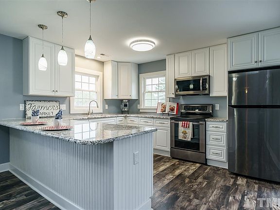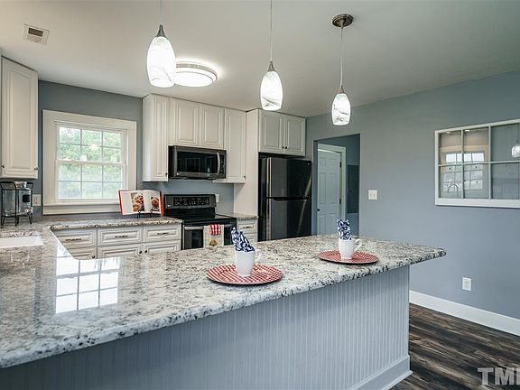Country Living at its best! Close to Raleigh & Durham. Beautifully remodeled home & finished garage! Completely renovated in 2017 with new roof, windows, dry wall, insulation, HVAC, water heater,sealed/conditioned crawl space, electrical, plumbing,appliances, flooring,paint, cabinets, granite counters, bathroom & more! Home features 3 bedrooms/1 bath.Finished garage enjoys functional kitchen, office, loft & 1.5 baths! This property is a rare find at just over 1 acre AND a 2 car garage! Survey in kitchen