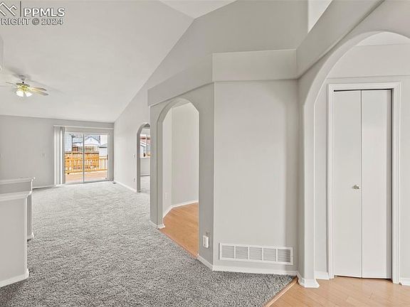 This charming ranch-style residence is nestled in the desirable Windmill Mesa subdivision, boasting impeccable condition throughout. Upon entry, you'll be greeted by a seamlessly flowing floor plan adorned with elegant arches and vaulted ceilings. The inviting living room features a cozy fireplace, while the adjacent kitchen offers a convenient dining area. Recent upgrades include fresh paint and carpeting, enhancing the home's appeal. The primary suite boasts an attached full bathroom, providing comfort and convenience. Another bedroom and bathroom are situated on the main level for added functionality. Descend to the basement to discover a spacious recreational room, along with two additional bedrooms and another full bath. Step outside to the backyard oasis, where a delightful deck awaits, perfect for summer gatherings. Enjoy the sizable yard and the convenience of a shed for extra storage. This residence is impeccably presented and offers swift access to nearby amenities such as shopping and schools. With its move-in readiness, this home eagerly awaits its new occupants, offering an ideal opportunity for immediate occupancy.