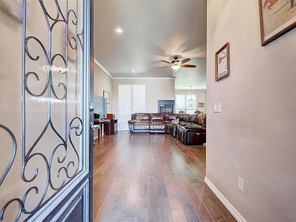 Discover the perfect blend of space, privacy and luxury in this stunning 3-bed, 2.5 bath home. The Owner's suite is a sanctuary with a spacious bath, complete with walk-in closet. Need extra space? This home offers a versatile room can be a bonus room/study or a 4th bedroom to fit your personal needs! The kitchen is a chef's paradise featuring 3cm granite countertops, a large island, walk-in pantry, gas stovetop and ample counter-space. Prepare meals with ease and entertain with flair. Enjoy the luxury of wood flooring throughout the main areas, and elevated gas fireplace for cozy evenings, a sprinkler system for easy lawn maintenance, a security system and in ground storm shelter for peace of mind. Nestled on a corner lot this home offers quick access to the heart of the city! Don't miss out on this exceptional opportunity to call this home yours!