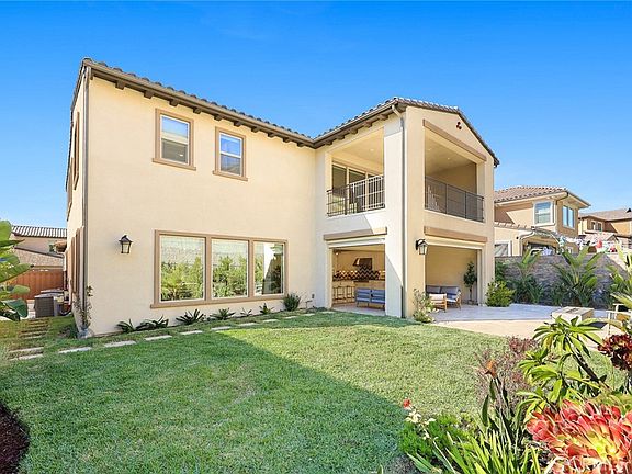 Located in highly desirable gated community of Portola hills, this stunning single family house features 4 bedrooms, 3.5 baths and a loft/bonus room! Open floor plan, Recessed lighting, custom shades. High ceiling living room with cozy fireplace, spiral staircase, spacious dining room, gourmet kitchen with oversized island, granite countertop and upgraded backsplash, 6 burner gas stove, double oven, built-in refrigerator. Prep kitchen area with a lot of storage, walk in pantry and second refrigerator. Sliding door to California room with motorized shades. Huge backyard with fire pit, fruit trees and grassy area. One downstairs bedroom with view, full bath. Powder room. Upstairs you will find that the loft/bonus room, laundry room and one guest bedroom all have city views! Expansive master bedroom with private balcony, bathroom with double sinks, shower, free-standing tub and two walk-in closets. The other guest bedroom and hallway bathroom complete the second floor. Attached two-car garage. Soft water system, paid-off solar. Community amenities include swimming pool, kids' wading pool and spa, tot lot, outdoor BBQ area, etc. Close to shopping centers and freeway. This home is a must see!