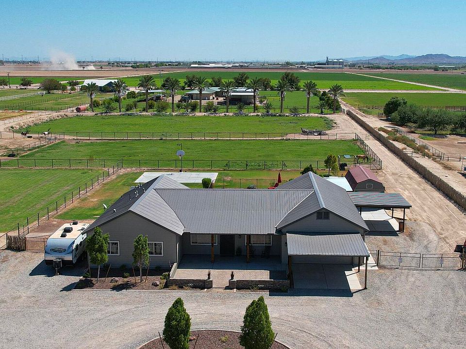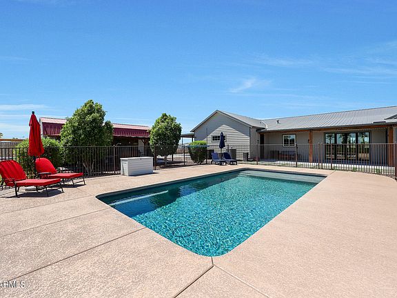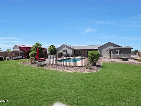 OWNER AGENT. This property sale includes 2 parcels of irrigated acreage (3.324). Custom Modern Farmhouse built in 2020 with 4 bedrooms and 2 baths, open floor plan that showcases the open kitchen and great room as the heart of the home. From the great room enjoy stunning sunrises, sunsets, a glowing fire in electric fireplace, or enjoy the view of the lush green yard, sparkling fenced pool, and surrounding views to outdoors. Exceptional kitchen for gatherings with enormous island, stainless steel professional appliances include wall oven and built-in microwave, electric range, built in refrigerator and freezer, Bosch dishwasher. Large Private Main Suite boasts curbless walk-in tiled shower, his and hers extended vanities, and 2 custom designed walk-in closets with access to laundry room. Cooled Pool/Play house (approx 180 sq ft) has half bath and outdoor shower, and room to lounge. Attached air conditioned 807 Sq Ft (34X24) workshop with garage door or double door built in option with 2-car slab carport for additional workspace. Additionally, a large WeatherKing lofted barn with single garage door near shop carport. Oversized 24 x 26 garage with additional 2-car slab carport. Front porch has extended rock front courtyard and pavers. Back porch extended with pavers and turf with additional paver patio. Misting System at back patio and poolside. Concrete Court with basketball hoop. The property is cross fenced and perimeter fenced and gated with no-climb metal fencing and some cedar stays for privacy. THIS OFFERING IS PARCEL 504-43-029 AND 504-43-002Z.