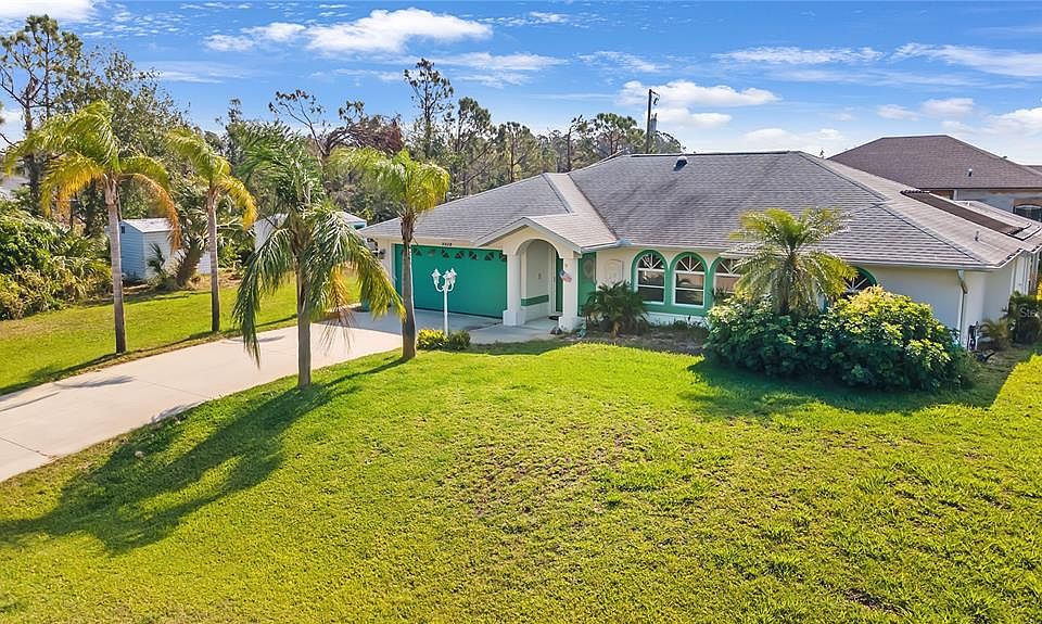 SOLAR HEATED POOL HOME ON DOUBLE LOCATED IN GULF COVE! Three Bedroom, 2 bath, 2 car garage (20' X 19' with utility sink), fenced back yard and room to grow. The 1,920 square foot home sits on a double lot and has two sheds with electric on the corner lot with 3 additional lots. Walking into to the double entry doors to the foyer you enter with a living room and formal dining area. Eat-in kitchen with granite counter tops, recessed lighting and tubular skylight allowing for natural light in the kitchen which is open to the family room. Master bedroom with en-suite with roman shower and double vanities. Two bedrooms on the opposite side of the home with the guest bathroom leading out to the pool. Pool is surrounded by screened pool enclosure and great 11' x 22' lanai area for entertaining. Master bedroom, formal dining and one guest bedroom have sliding glass doors and two sliding glass doors in the kitchen all leading out to the entertaining pool area. In-side laundry with skylight offering natural light. Hot water heater is 9/2013 , Air Conditioner is 10/2009, roof 2013, home is wired for full home generator, irrigation system with well, deck restored in pool area, and hurricane shutters. Just 1/2 mile from the private Gulf Cove boat ramp and beautiful park on the Myakka River. Furnishings are negotiable. Property Owners of Gulf Cove, Inc. may apply for Membership and Ramp Decal Info: Any property owner, which includes vacant lot owners as well as home owners in Gulf Cove, may apply for membership in the Property Owners Of Gulf Cove Inc. association. Annual membership dues are currently $65.00 per year. Yearly membership runs from January 1 through December 31.