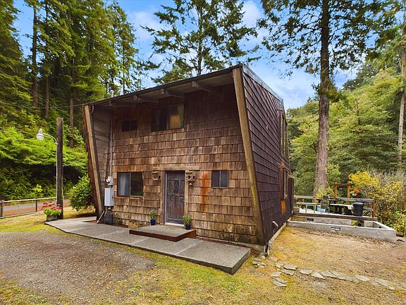 Looking for a well appointed cabin in the woods, with epic views, in the wilds of Humboldt but just minutes to downtown Arcata? Well look no further, this gorgeous cabin is situated on an acre of land with Jacoby Creek meandering below it. This 2 bedroom 2 bath home has soaring ceilings, open beam construction and floor to ceiling windows giving you the feeling of living in sync with nature. As you enter the home you will be greeted by an open living concept, which includes the downstairs bedroom, laundry room/pantry, full bathroom with beautiful built in accents and the kitchen and living room. The kitchen boasts custom cabinetry, an island with cooktop, stainless steel appliances and cheerful cobalt blue tile countertops. A staircase will take you to the spacious loft style primary suite, equipped with a half bath and a large heated whirlpool tub to unwind at the end of the day. Did I mention the views from the loft, every window gives the feel of living in a tree house. All of this on an acre of land with a large wrap-around deck for entertaining, mature landscaping, plenty of room for a garden and your 4 legged friends, 2 sheds and a Conex container for storage, a backup diesel generator for power outages and so much more! Don't miss this one, call your favorite Realtor today for a private showing!